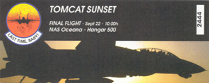 F-14 Final Flight On September 22, 2006, the official final flight of a US Navy F-14 Tomcat was celebrated at NAS Oceana. In front of an audience of several hundred US Navy and civil spectators, representatives from Northrop Grumman, the city of Oceana and the US Navy held speeches about the fabulous time with the Tomcat. ![]() The programm of the official Final Flight Events: