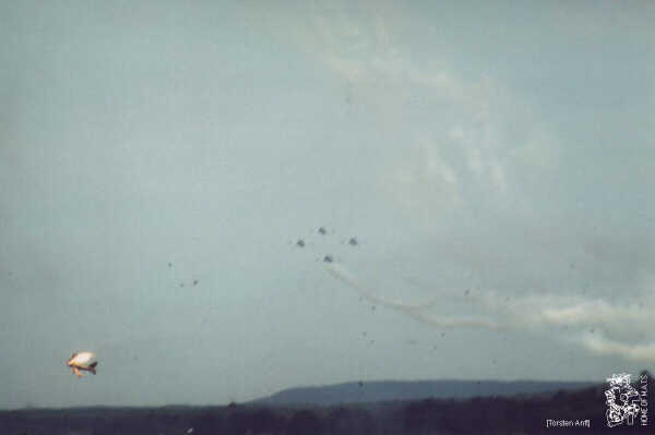 Aermacchi MB.339 Fatal Frecce Tricolori crash at the 1988 airshow at Ramstein AB, Germany. 70 people died when the solo pilot's MB.339 crashed into 2 other display aircraft and the wreckage hit the visitors crowd.