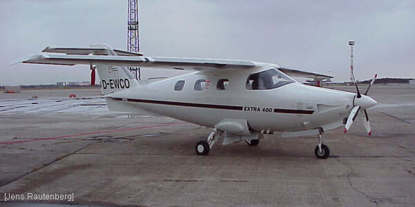 The Extra 400 is built by EXTRA Flugzeugbau GmbH (EXTRA Aircraft Manufacturing Company), the same company that built the most succesful 200 and 300 series aerobatic planes. The company owner Walter Extra won several times the world aerobatic championships. This latest EXTRA aircraft is a completely new design with a pressurized cabin and is made of composite materials. The Extra 400 is powered by a liquid cooled engine, equipped with fowler flaps and retractable landing gear. Prototype certification was given in early 1996 with its maiden flight in April that year. The Extra 400s design has been certified in accordance to the Federal Aviation Regulations FAR23. 3-Side-View of an Extra 400