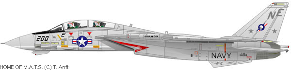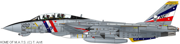 Fighter Squadron TWO traces its roots to the earliest days of Naval Aviation. Commisioned in 1922, Fighting TWO was the first squadron to deploy aboard the US Navy's first aircraft USS Langley (CV-1). Throughout the 1920's and 30's, VF-2 operated from a variety of carriers and saw aviation's transmission from two wing, fabric covered bi-planes to the first all-metal monoplanes. During WWII, VF-2 compiled an outstanding record in combat. From the carrier USS Lexington (CV-2), VF-2 halted the Japanese expansion toward Australia during the Battle of the Coral Sea. While flying the F6F Hellcat fro mthe decks of USS Enterprise (CV-6) and USS Hornet (CV-12), the squadron destroyed over 500 enemy aircraft and sank over 50,000 tons of enemy shipping while losing only seven of their own planes. Life Magazine described Fighting TWO as "The Hottest Fighter Squadron in the Pacific". At the end of WWII, VF-2 was disestablished, and remained absent from Naval Aviation for 27 years until it was selected to introduce the F-14 Tomcat to the fleet. Reestablished at NAS Miramar 14 October 1972 the squadron completed crew training and received it's first F-14s in July 1973. Full squadron strength of 12 aircraft was reached in spring 1974 since Tomcat production was still running at a fairly low rate. As with VF-1 the squadron flew top cover over the Saigon evacuation in Operation Frequent Wind. The squadron formed the TARPS unit for both CVW-14 and CVW-2, deploying aboard USS Enterprise (CVN-65) at first, then switching to USS Ranger (CV-61) where they stayed till 1993, apart from a single cruise aboard the USS Kitty Hawk (CV-63) in 1984. During it's time as an F-14 operator VF-2 has been highly successful in the various awards it has collected. These include 3 COMNAVAIRPAC (Commander of Naval Air Forces Pacific) Battle "E"s during the 1980's. A Battle "E" signifies the squadron is the most efficient in the Pacific fleet. VF-2 also won 3 Boola-Boola awards between 1985 and 1987, a prize given to the squadron that accumulates the most points on it's annual missile shoot. The coveted "Mutha" trophy was also won 3 times, an award presented to the best F-14 squadron in the Pacific fleet. VF-2 has also won awards in the West Coast TARPS, Fighter Derby, ECCM and High Noon Gunnery competitions.