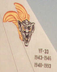 September 1943 - October 1993 Established in September 1943, VF-33 were first equipped with the Grumman F6F "Hellcat". Their first operation was to the Soloman islands, the first time a US Navy squadron has used the F6F in combat. VF-33 was land based at this time, supporting the island hopping Pacific campaign. VF-33 disestablished in July 1946. VF-33 was re-established on the 11th of October 1948, this time flying the famous Chance-Vought F4U "Corsair". After seeing action during the Korean war (and being awarded the Navy Unit Citation for their success) several changes of equipment and location followed in quick succession. By 1962 the unit was flying F8U-2NE "Crusaders" from the world's first nuclear powered aircraft carrier, the USS Enterprise (CVN-65) and as part of this team took part in the blockade of Cuba. In 1964 the squadron started to become familiar with the aircraft which (in two different versions) would last them the next 17 years and became the backbone of Naval Fighter Aviation. The plane was, of course, the F-4 "Phantom II". Initially equipped with the F-4B, VF-33 set a new Atlantic Fleet record by winning the CNO Aviation Safety Award for four years in a row (1961-64). However VF-33's time with the F-4B was short and in 1967 they upgraded to the F-4J. The new F- 4 featured a different radar, higher thrust engines, slatted tailplanes, extra fuel cells and larger main wheels (to handle the increased weight). Almost as soon as the new F-4's were received VF-33 was once again deployed to combat, this time to South-East Asia onboard USS America (CV-66). During their time in theatre VF-33 dropped over 3,000,000 pounds of ordnance! This was in the space of 4000 combat hours flown over 5 months. On the 10th of July 1968 a VF-33 bird downed a MiG- 21C, the first air to air kill by an East Coast Fighter squadron over N.Vietnam. After returning from Vietnam VF-33 continued it's association with CVW-7 and USS Independence (CV-62), deploying most years. Several awards were won during this time, including the CNO safety award in 1969 and 1970. The 75-76 cruise saw the squadron win the Golden Tailhook Award, recognising it's skill at carrier landing. February 1979 saw VF-33 achieve 3 years of accident free flying. In 1981 VF-33 entered a new era, with the introduction of the F-14A Tomcat. As the transition took place VF-33, who up until this time had the official squadron name of "Tarsiers", began to unofficially use their callsign, "Starfighter" as the squadron name, perhaps inspired by the huge increase in capability the F-14A brought.
