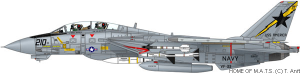Another AIRLANT record fell to VF-33 on the 20th of August 1985, as the squadron became the first to complete 50 missile firings without a single failure, testimony to the skill of VF-33's Ordnance and IWT shops, part of the AV-ARM division. Another deployment onboard USS America (CV-66) as part of CVW-1 began in March of 1986, this time headed for the southern Mediterranean. VF-33 and VF-102 provided air cover for the carrier battle group as it moved south of Colonel Ghaddafi's "Line of Death" (Ghaddafi claimed that Libya's territorial waters extended 12 miles from the Libyan coast, as opposed to the internationally recognised limit of 3 miles. Any plane or ship crossing that line was thus within Libyan waters, Ghaddaffi claimed, and thus liable to attack). On the 15th of April 1986, after a terrorist attack on a west German disco hall, President Reagan ordered airstrikes against targets within Libya. F-111F bombers, from the 48th Tactical Fighter Wing (TFW), based at RAF Lakenheath, United Kingdom, attacked targets in Tripoli, while Navy A-6's from the carriers America and Coral Sea attacked Benghazi harbour. Navy and Marine Corps F/A-18A Hornets and Navy A-7E's attacked Sam sites with HARM missiles. The Tomcat squadrons provided aerial cover for the entire strike force. Also in 1986 VF-33 flew 895 continuous sorties without an abort, a record that stands within the F-14 community to this day. 1987 began with a short cruise onboard the Navy's newest carrier, USS Theodore Roosevelt (CVN-71), allowing CVN-71 to shake down prior to full introduction to service. 1987 also saw the unit officially become known as 'Starfighters', it's previous official name being 'Tarsiers', with the then commanding officer, CDR Tony Bucchi, designing the new squadron patch. The squadron members had unofficially referred to themselves as Starfighters for several years prior to this. As part of their flawless missile record VF-33 launched an AIM-54 Phoenix off the oldest active east coast F-14, BuNo 159010, an impressive achievement considering the complexity of the Tomcat's AWG- 9 radar system. Two more cruises onboard USS America followed, one in 1988 and one in 1989. February of 1990 saw VF-33 (and presumably VF-102) switched to CVW-9 onboard the USS Constellation (CV-64) for a two and a half month transit from San Diego to Philadelphia Naval Shipyard. The time was put to good use, however, with VF-33 performing several joint exercises with South American nations. Once in Philadelphia, Constellation began her Service Life Extension Programme (SLEP). Late 1990 saw the arrival of the Gulf crisis, as part of the multinational force deployed to the area VF-33, onboard USS America (CV-66) helped enforce the sanctions then participated in Operation Desert Storm, providing air cover to Navy and allied aircraft. After the success of Desert Storm VF-33's days were numbered. In October 1993 the squadron had the dubious honour of being the first F- 14 squadron to be disestablished in the recent round of cuts. This was due to the Navy move from 2 F-14 squadrons per air wing to 1. F-14A, 1988 ![]() |
