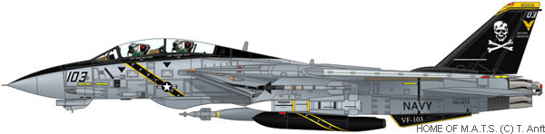 In 1996, a new set of claws were added to Tomcat's already formidable arsenal--the newly acquired LANTIRN (Low Altitude Navigation and Targeting Infrared for Night) pod. The LANTIRN pod enables the crew to see what lies ahead in far more detail than with radar, day or night. It allows the F-14 to designate targets for its own, or other aircraft's laser-guided munitions. The pod also has an integrated global positioning system. Being a self-contained unit, the pod can be moved from one F-14 to another with minimum fuss. On 28th of June, only two weeks after its official unveiling ceremony, the LANTIRN pod made its operational debut with the new Jolly Rogers, when VF-103 set sail for the Mediterranean aboard USS Enterprise (CVN-65), carrying six pods with them. Although initially there are only a limited number of LANTIRN units to go around, eventually all of Navy's remaining Tomcat squadrons will be equipped with them. Since its earliest days, VF-103 has adorned the tailfins of their aircraft with a horizontal yellow arrow outlined in black. The original squadron insignia was a cloverleaf. Later a stylized aircraft darting through the leaf was added, along with a baseball bat. The baseball stemmed from an early skipper who often carried one with him. In 1991, VF-103's birds began to use its squadron insignia as their tail-art, in place of the trademark bold arrow. F-14B, late 1980s ![]() F-14B, 1995 ![]() F-14B, 1998 ![]() F-14B, 2004 ![]() |