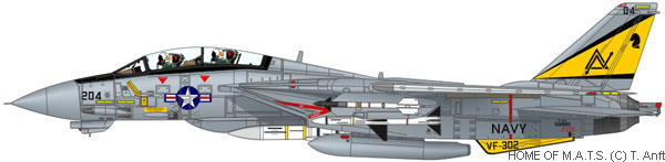April 1985 - 11 September 1994 VF-302 stood up on the 21st of May 1971, less than a year after VF-301. From its inception until November 1973 they operated the F-8K Crusader, at this point trading in their Crusaders for F-4B Phantom II's. Like their sister squadron Vf-302's time with the B model was short, the squadron moving to the N in January 1975. During their time with the F-4N VF-302 won the USNR Battle 'E', signifying them as the best fighter squadron in the Naval Reserve. 1981 saw the wind of equipment change blow again, when VF-302 started to move to the F-4S. After four years operating the last F-4 variant VF-302 began to receive the F-14A in February 1985. They and VF-301 deployed onto the USS Ranger in January 1986, performing their first carrier qualifications in F-14's. Two years later the squadron got more carrier experiance spending 12 days onboard the USS Enterprise between the 10th and 22nd of August 1988. 1986 had seen VF-302 pick up the TARPS mission, the first Reserve squadron to do so and in 1988 they had a chance to practice these skills as part of the Reconnaissance Air Meet '88 (RAM '88) at Bergstrom AFB in Texas. As well as other TARPS equipped F-14 units the meet allowed VF-302 crews to meet Air Force reconnaissance crews, to train together and most importantly to trade sea stories. VF-302 went the way of all old fighter squadrons, being disestablished on the 11th of September 1994. F-14A ![]() |