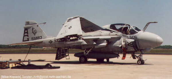 A-6 Intruder![]() The Grumman design G-128, the latter A-6 Intruder, was designed to meet a 1956 Navy requirement for an all-weather low-level, long-range strike aircraft. First flight of the Intruder took place on 9 April 1960 and the Intruder should stay in service for the Navy for nearly four decades until its retirement in mid-1997. Several versions of the A-6 entered fleet- service: A naval bomber (A-6A/B/C/E), an electronic countermeasures aircraft (EA-6A) and an airborne tanker for inflight refueling (KA-6D).