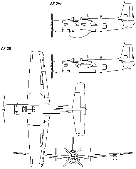 AF-2 Guardian The AF Guardian was developed as a replacement for the Navy's TBF Avenger anti-submarine search & strike aircraft. Grumman's G-70 design even featured a turbojet engine in the tail for high escape speeds instead of any defensive armament as in the TBF Avenger. The first prototype flew on 19 December 1945 and it was discovered that the increase in speed produced by the turbojet was not high enough and so this addition was cancelled. Two variants of the Guardian were produced: The AF-2S for torpedo or bombing missions and the AF-2W with the large ventral radar. The latter was manned by a crew of three instead of one pilot only. Two radar operators found a place to work in the fuselage. The AF-2S was equipped with much smaller radar under one of the wings. Both Guardians worked together in a team: The AF-2W detected the target and the AF-2S attacked it. 153 AF-2Ws and 193 AF-2Ss were built until 1953. Additionally, some 40 AF-3S (with a MAD (Magnetic Anomaly Detection) radar under the fuselage were delivered in 153. ![]() AF-2S