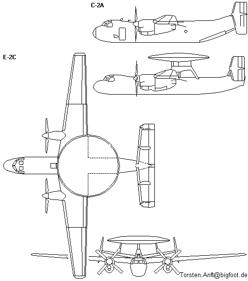 E-2 Hawkeye, C-2 Greyhound![]() First known as the W2F-1, the redesignated E-2 Hawkeye (late 1961) became from 1960 onwards the US Navy's only airborne early warning and control platform, like the land-based E-3 Sentrys AWACS. Therefore, the E-2C is also called "Mini-WACS". The Hawkeye made its maiden flight on 21 October 1961. ![]() The C-2A Greyhound (upmost graphic) is a E-2 derivative and flew for the first time on 18 November 1964. The C-2 design uses the same wings, power plant and tail unit as the Hawkeye. Its role is Carrier Onboard Delivery (COD). ![]() E-2C