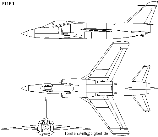 F11F-1 Tiger The F11F-1 origins from the Grumman design G-98 and first flew on 30 July 1954. The Tiger operated as a day fighter and is manned by one pilot. Some 201 F11F-1s (199 F11F-1s and 2 F11F-1F) were built until the Navy began to phase out the Tiger during 1959. In 1962 the F11F-1 was redesignated F-11A. From 1957 to 1968 the Navy's Blue Angels aerobatic team flew the Tiger. Finally, Grumman projected an all-weather capable F11F, designated F12F (BuNo. 143401, 143302). The development was cancelled and the F12F never flew. ![]()
